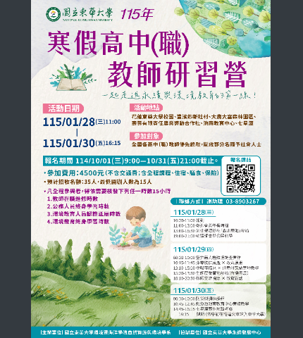 轉知東華大學辦理115年寒假高中職教師研習營來文與實施計畫各1份,歡迎教師踴躍參與。