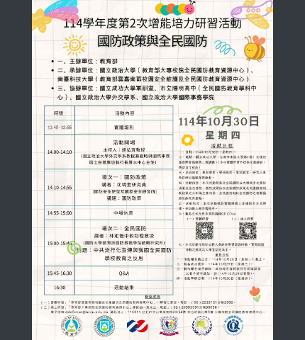 轉知全民國防教育資源中心辦理114學年度增能培力研習來文與實施計畫各1份,歡迎教師踴躍參與。