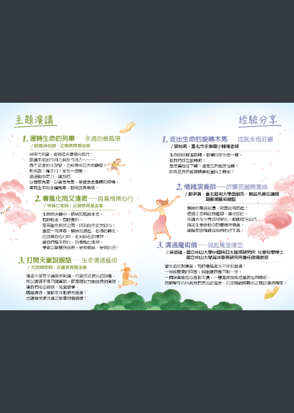 二、本基金會與臺北市立成淵高級中學、新北市立三民高級中學、桃園市立仁和國民中學、宜蘭縣立東光國民中學、新北市永和區秀朗國民小學、新北市新莊區光華國民小學、基隆市暖暖區碇內國民小學,共計 7所學校合辦教師研習活動「生命的圓滿──尋覓教師的春天」,說明如下: