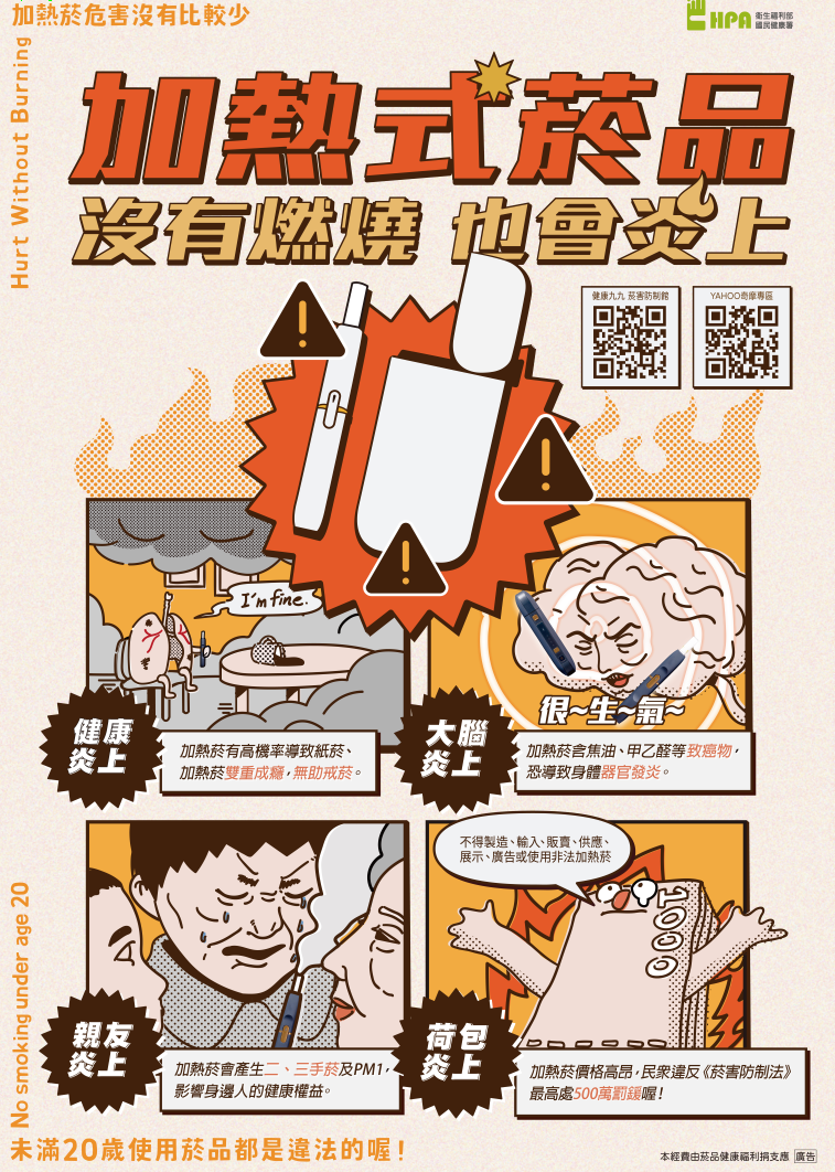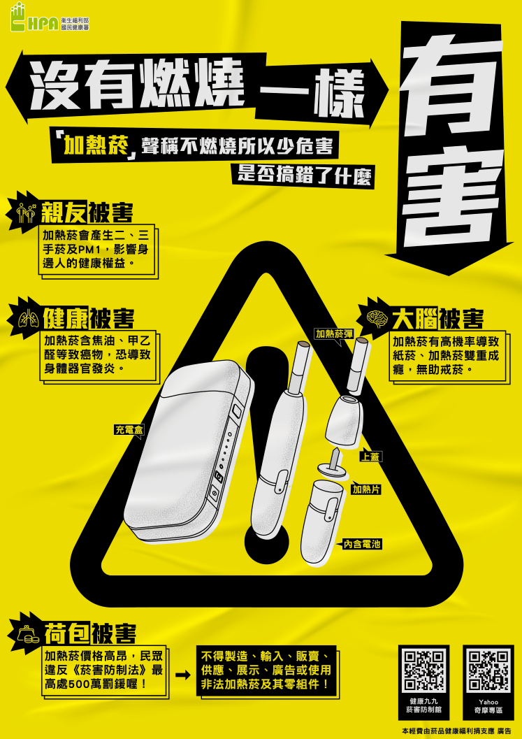 三、為擴大宣導效益,請貴單位協助張貼海報並運用跑馬燈露出「任何人不得使用類菸品(含電子煙)及未經核定通過健康風險評估審查之指定菸品(含加熱菸),最高可罰1萬元」加強宣導,提醒民眾切勿違規使用。