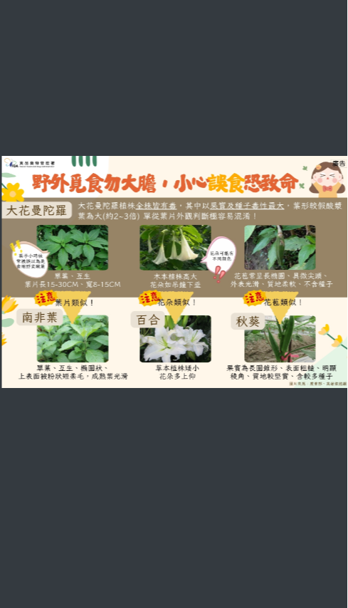 勿隨意採食野外植物:許多外觀類似可食用植物的野生品種,實際上含有劇毒,如「大花曼陀羅」外觀常被誤認為「南非葉」、「百合」、「秋葵」等食用植物,誤食可能造成幻覺、心跳加快、呼吸困難等中毒症狀。
