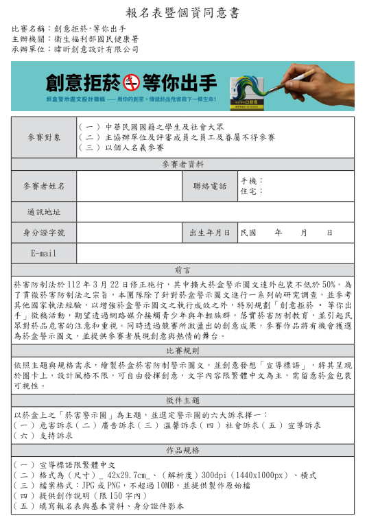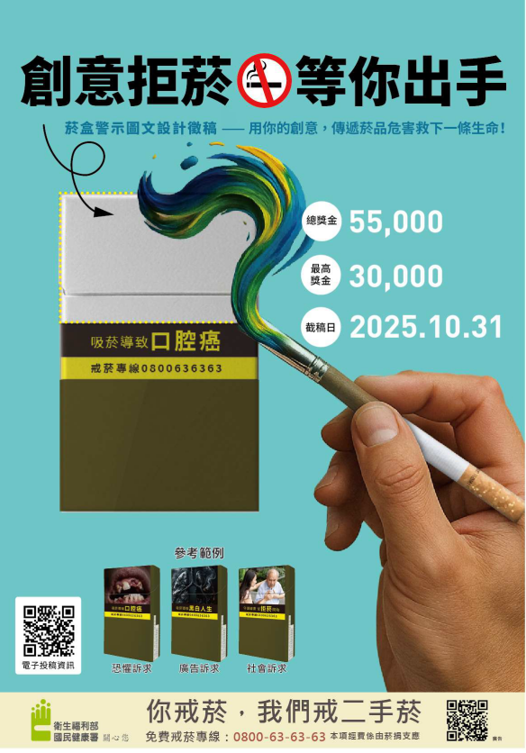 二、國健署為貫徹菸害防制法之宗旨,規劃旨揭徵稿活動,期望透過網路媒介接觸青少年與年輕族群,落實菸害防制教育,並引起民眾對菸品危害的注意和重視,參賽作品將有機會獲選為菸盒警示圖文;活動徵稿期間自即日起至114年10月31日止,請協助運用多元管道宣傳周知,並鼓勵所屬同仁、學生踴躍參與。