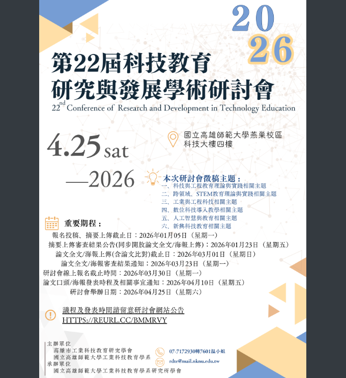 檢送國立高雄師範大學工業科技教育學系辦理之「2026—22nd科技教育研究與發展學術研討會」論文徵稿資訊,敬請本校師生踴躍投稿及報名參加,詳如附件,請查照。