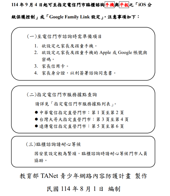 (一)本部已建置免費「數位工具包」資源,提供圖解操作手冊與教學影片,協助家長設定子女手機使用時間、過濾暴力與色情等不當內容等功能,相關資源連結:https://gov.tw/bLU。倘家長無法自行完成安裝,亦可至三大電信業者(中華電信、台灣大哥大電信、遠傳電信)指定之直營門市(https://reurl.cc/gn7jMX),經簽署同意書後,由門市人員現場協助其自行安裝或設定該功能並指導使用。