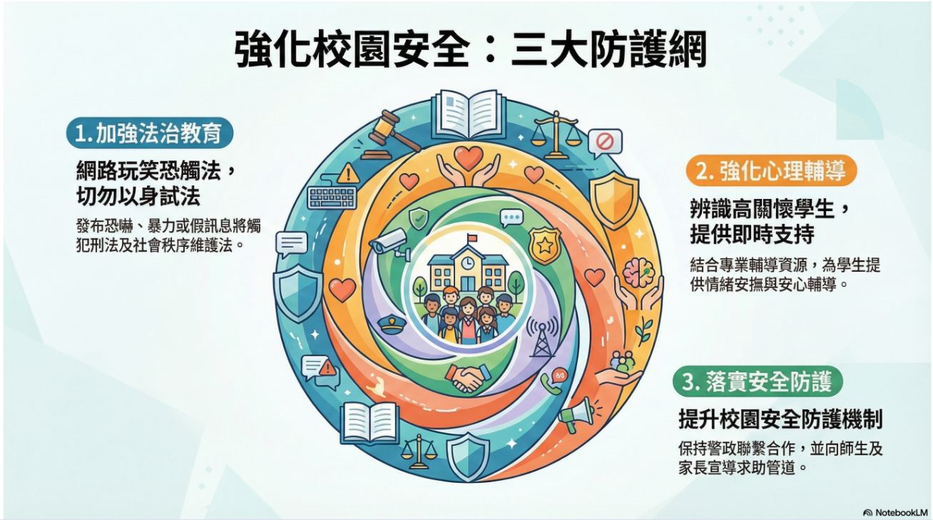 三、學校將加強校園安全防護工作,與警政保持校安聯繫合作機制,並落實校園安全各項工作。