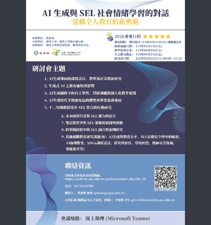 檢送靜宜大學教育研究所舉辦「AI生成與SEL社會情緒學習的對話:建構全人教育的新典範」學術研討會徵稿相關資訊,敬請本校師生踴躍賜稿為荷。