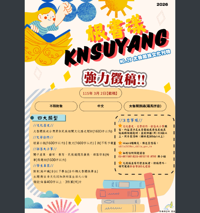 檢送花蓮縣秀林鄉公所辦理115年度「太魯閣族文化刊物製作出版計畫」-第26期文案徵稿,惠請廣為宣傳周知,詳如,請查照。