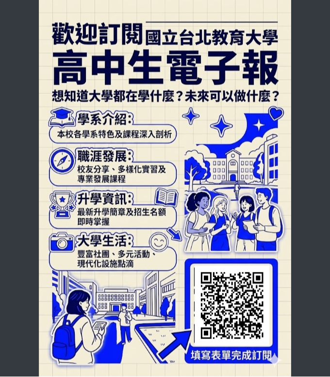 國立台北教育大學自2026年起發行高中生電子報,敬請本校師生踴躍訂閱,詳如附件,請查照。